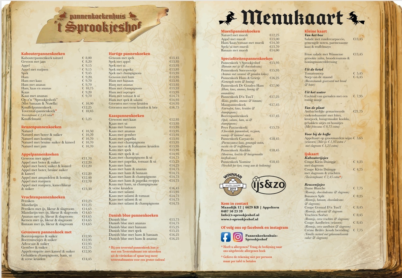Pannenkoeken voor groot en klein, bij Pannenkoekenhuis 't Sprookjeshof hebben we het allemaal. Naast pannenkoeken hebben we ook een kleine kaart en een (grote) ijskaart. Klik op het onderstaande knop om de menukaart te bekijken.
